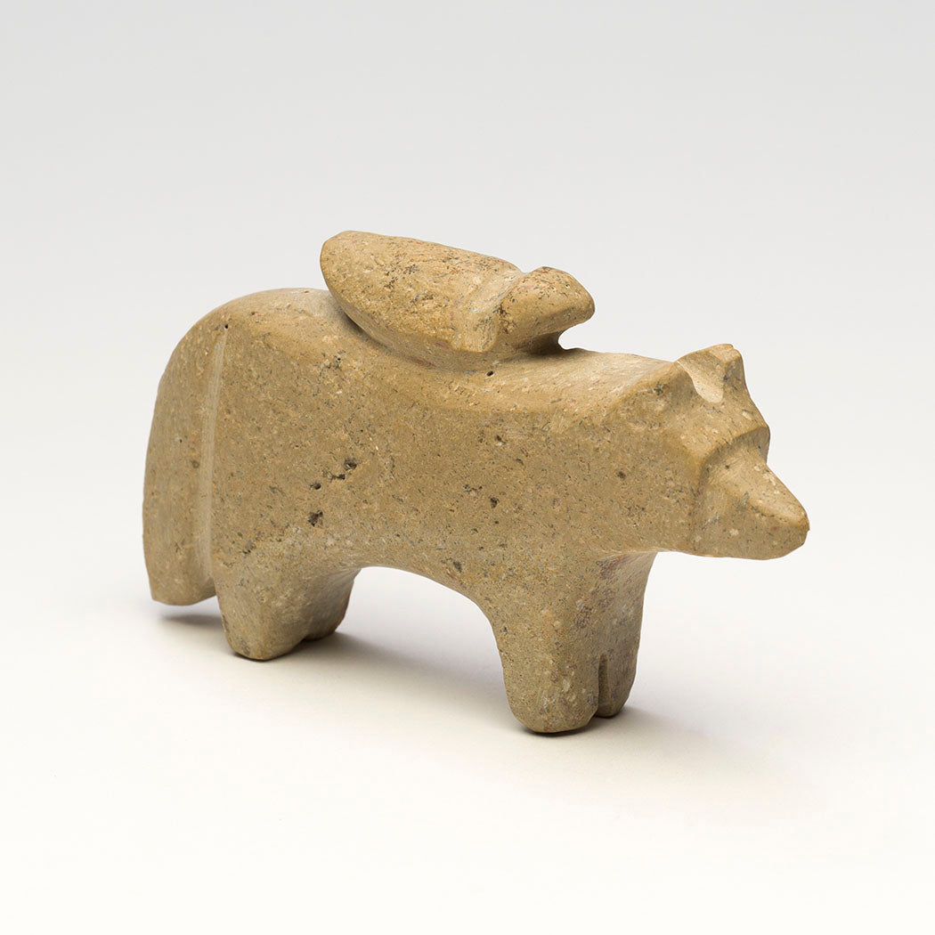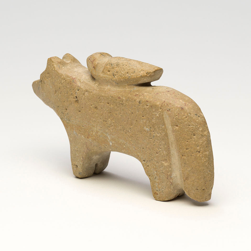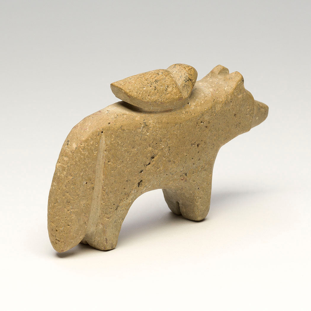 A feathered friend hitches a ride on a Wolf (Coyote or Fox) companion carved from one found stone. Salvador Romero's unusual friend pairings represent the "rawness" we are born with when we haven't put up our boundaries. As we get older we get "cooked" and begin to see ourselves as separate from others. Although different, this bird and bushytail pair love each other. About 5" long, 1 1/8" wide and 2 7/8" tall.