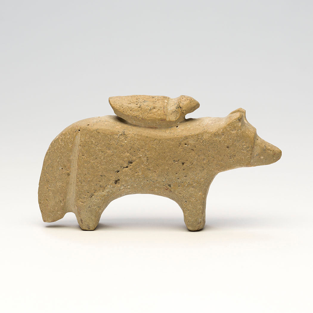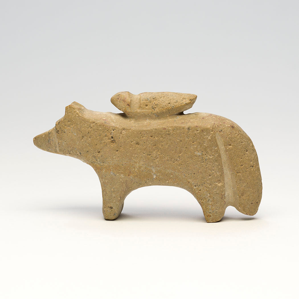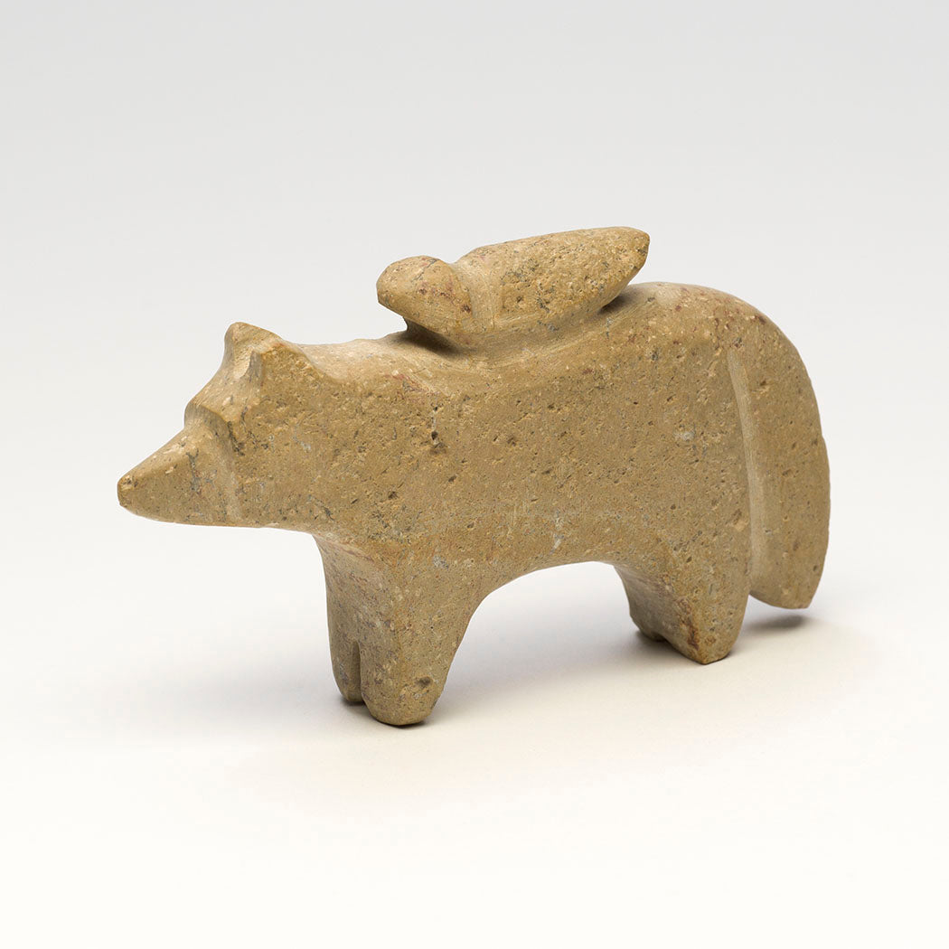 A feathered friend hitches a ride on a Wolf (Coyote or Fox) companion carved from one found stone. Salvador Romero's unusual friend pairings represent the "rawness" we are born with when we haven't put up our boundaries. As we get older we get "cooked" and begin to see ourselves as separate from others. Although different, this bird and bushytail pair love each other. About 5" long, 1 1/8" wide and 2 7/8" tall.
